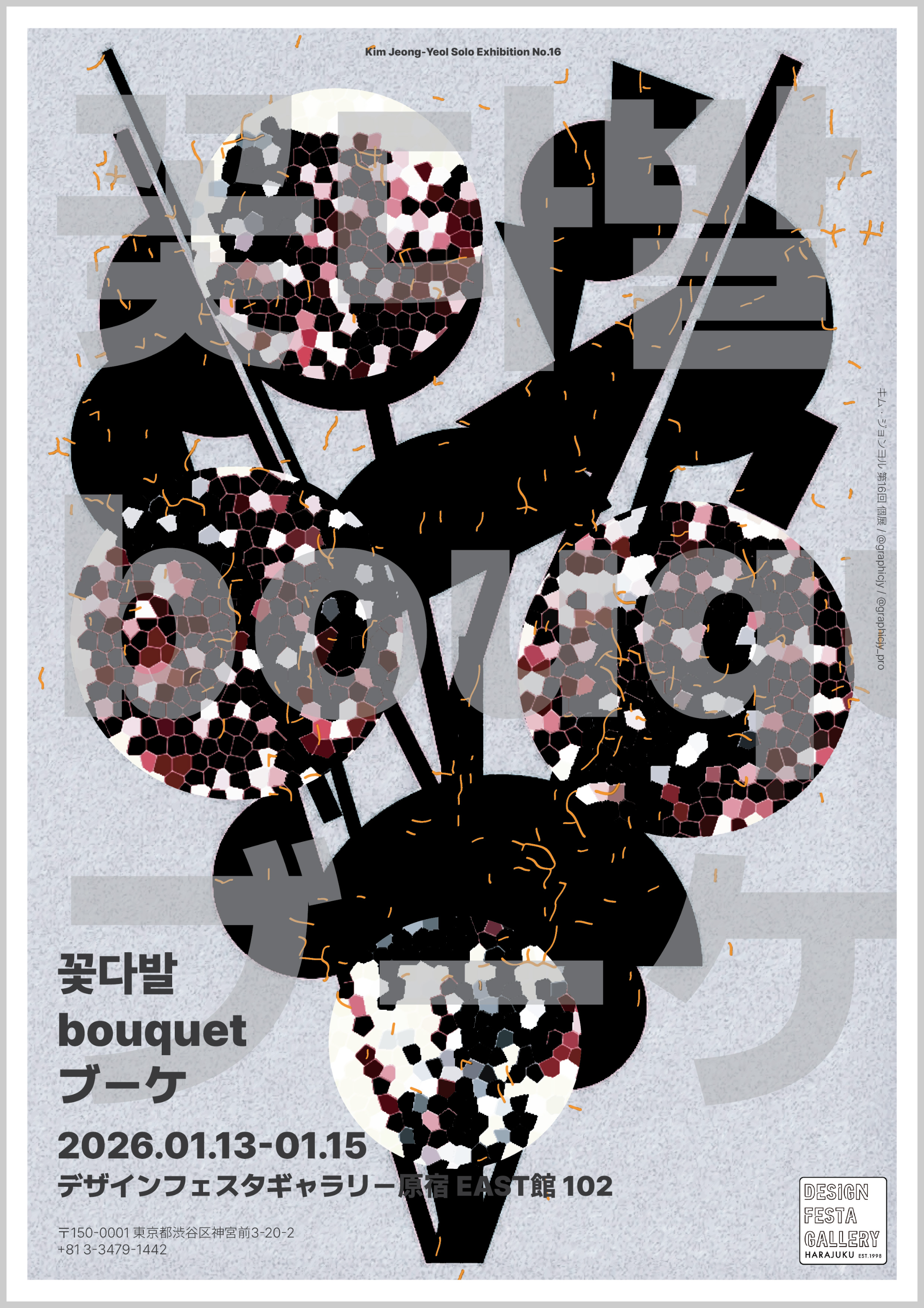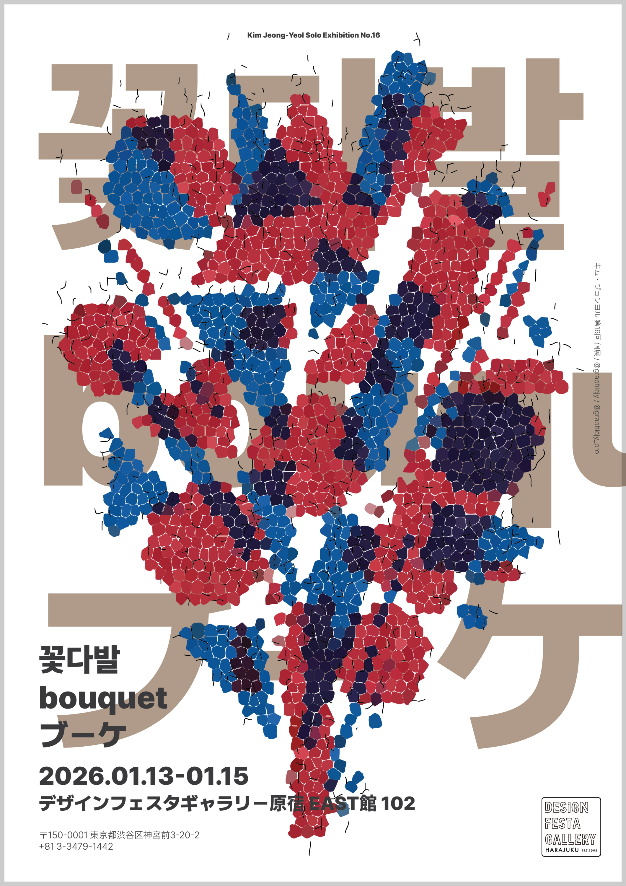 キム・ジョンヨルの第16回個展《ブーケ》は、色彩の最小単位が集積される過程を通じて、形象と感情が生成されるメカニズムを探究する試みである。本展は、完成されたイメージそのものよりも、イメージが形成されていくプロセスと、その内部で生起する関係的意味に焦点を当て、「集まっている状態」そのものを造形的・概念的主題として提示する。作家の画面は、点・線・面へと分節された色の単位が反復的に蓄積される構造を有している。この構成方法は、個々の要素の自律性を保持しつつ、全体との緊密な相互作用を可能にし、部分と全体の関係を流動的に再編成する。とりわけ、赤や青、そして深みのある色調による幾何学的形態は、視覚的な緊張と均衡を生み出し、感情の密度や時間の堆積を視覚的に喚起する。《ブーケ》というタイトルは、装飾的な対象を指すものではなく、異なる感情や記憶、時間が集合することによって形成されるイメージの状態を象徴している。それは、個と集団、瞬間と持続、感覚と記憶の関係を思考へと導く装置として機能し、単一の意味に固定されない開かれた構造を保っている。また本展は、デジタル環境において絶えず生成と解体を繰り返すイメージの感覚を、絵画的・グラフィック的言語へと再翻訳する。画面に残された不完全な痕跡や微細な変化は、秩序と偶然、制御と非決定性の境界を可視化し、イメージが固定された結果ではなく、持続的に生成され続ける過程であることを示唆する。本展は明確な解釈を提示するのではなく、鑑賞者の感覚や記憶が介入する余地を開いている。拡散と結集を反復するイメージの構造の中で、鑑賞者は自身の経験を投影し、それぞれの《ブーケ》を構成していく。こうして《ブーケ》は、同時代の感情風景を静かに呼び起こす視覚的な〈場〉として機能する。